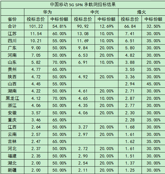 去年12月26日,中国移动公布了采购招标公告,经历近三个月之后终于有了结果。此次“中国移动2020年至2021年SPN设备新建部分集中采购”,华为、中兴、烽火三家投标总价超过250亿元。