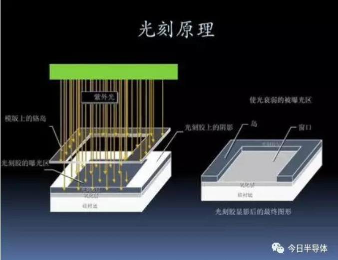 这里说一下,什么是光刻胶。我!要知道电路设计图首先通过激光写在光掩模版上,然后光源通过掩模版照射到附有光刻胶的硅片表面,引起曝光区域的光刻胶发生化学效应,再通过显影技术溶解去除曝光区域或未曝光区域,使掩模版上的电路图转移到光刻胶上,最后利用刻蚀技术将图形转移到硅片上。