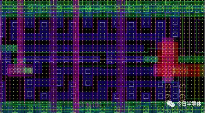 如果我们将设计的门电路放大,白色的点就是衬底, 还有一些绿色的边框就是掺杂层。