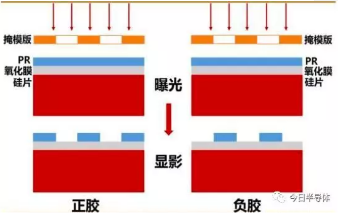 而光刻根据所采用正胶与负胶之分,划分为正性光刻和负性光刻两种基本工艺。在正性光刻中,正胶的曝光部分结构被破坏,被溶剂洗掉,使得光刻胶上的图形与掩模版上图形相同。相反地,在负性光刻中,负胶的曝光部分会因硬化变得不可溶解,掩模部分则会被溶剂洗掉,使得光刻胶上的图形与掩模版上图形相反。