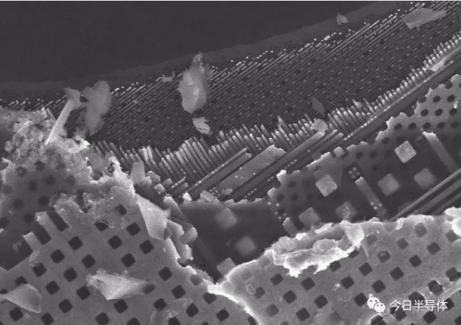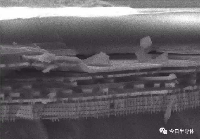 这)一个Top-down View 的SEM照片,可以非常清晰的看见CPU内部的层状结构,越往下线宽越窄,越靠近器件层。