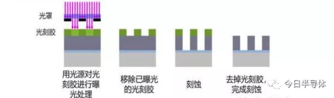 ,将抗蚀剂薄层未掩蔽的晶片表面或介质层除去,从而在晶片表面或介质层上获得与抗蚀剂薄层图形完全一致的图形。集成电路各功能层是立体重叠的,因而光刻工艺总是多次反复进行。例如,大规模集成电路要经过约10次光刻才能完成各层图形的全部传递。